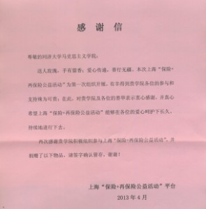 本次活动借助上海“保险+再保险公益活动”平台,所得衣物、书籍将由该平台全部捐赠给山西、贵州等地需要帮助的群体。一封朴实的感谢信,温暖人心。希望通过此次活动,能将学院的友爱、奉献精神传递下去,永不停歇。【学院党总支】