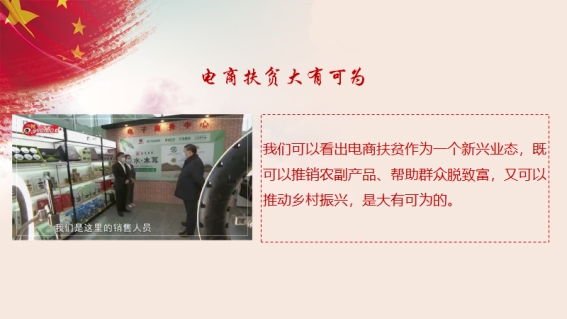 宣讲之后介绍了电商扶贫的定义、电商扶贫的五种模式及其四大作用,并分别附以各地实际的案例加以说明,如浙江省丽水市的“丽水样板”、央视新闻“助力脱贫攻坚之陕西湖北专场”、粤港澳大湾区“菜篮子”生产基地建设等,为展示电商扶贫全貌,推动以电商扶贫为砝码、产业扶贫为支点,撬动精准扶贫重担提供全面展示。