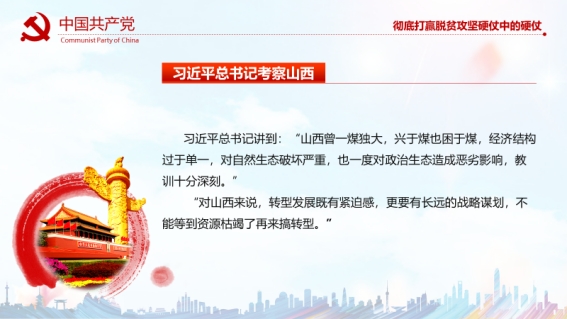 浙江余村和云南怒江州人民生态脱贫,生态致富的例子,我们不禁思考我们的家乡能否像他们一样利用生态环境实现脱贫,实现致富。宣讲员从习近平总书记对山西的评价开始谈起,以扶贫攻坚造林专业合作社进一步讲到山西省委省政府在近几年转型跨越发展中的努力。